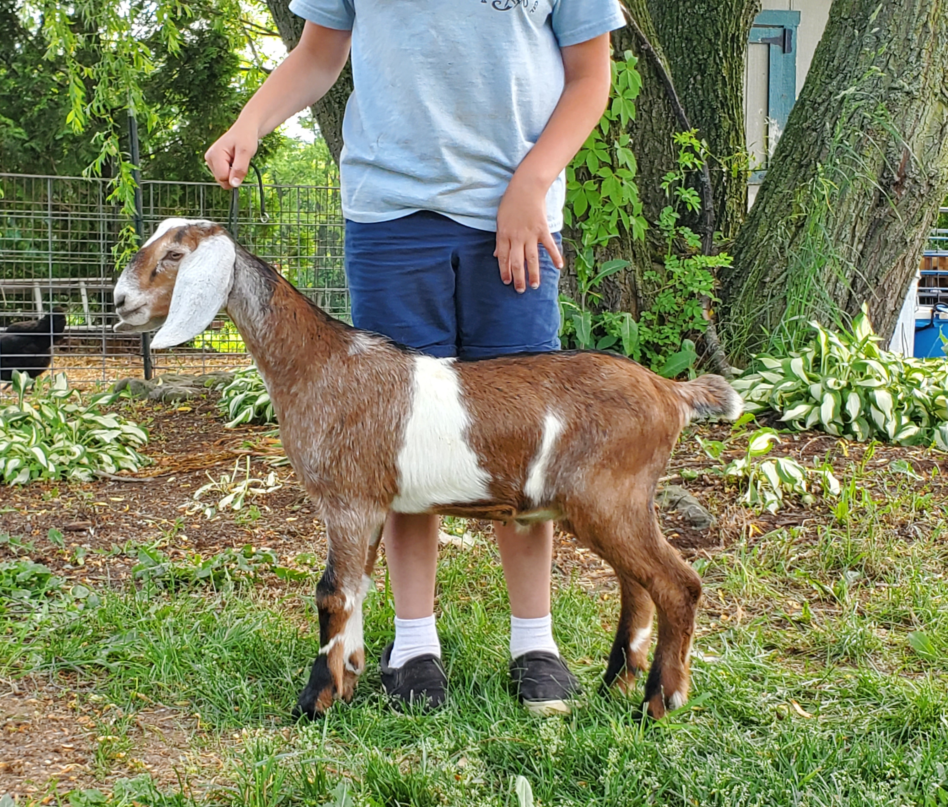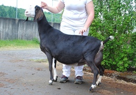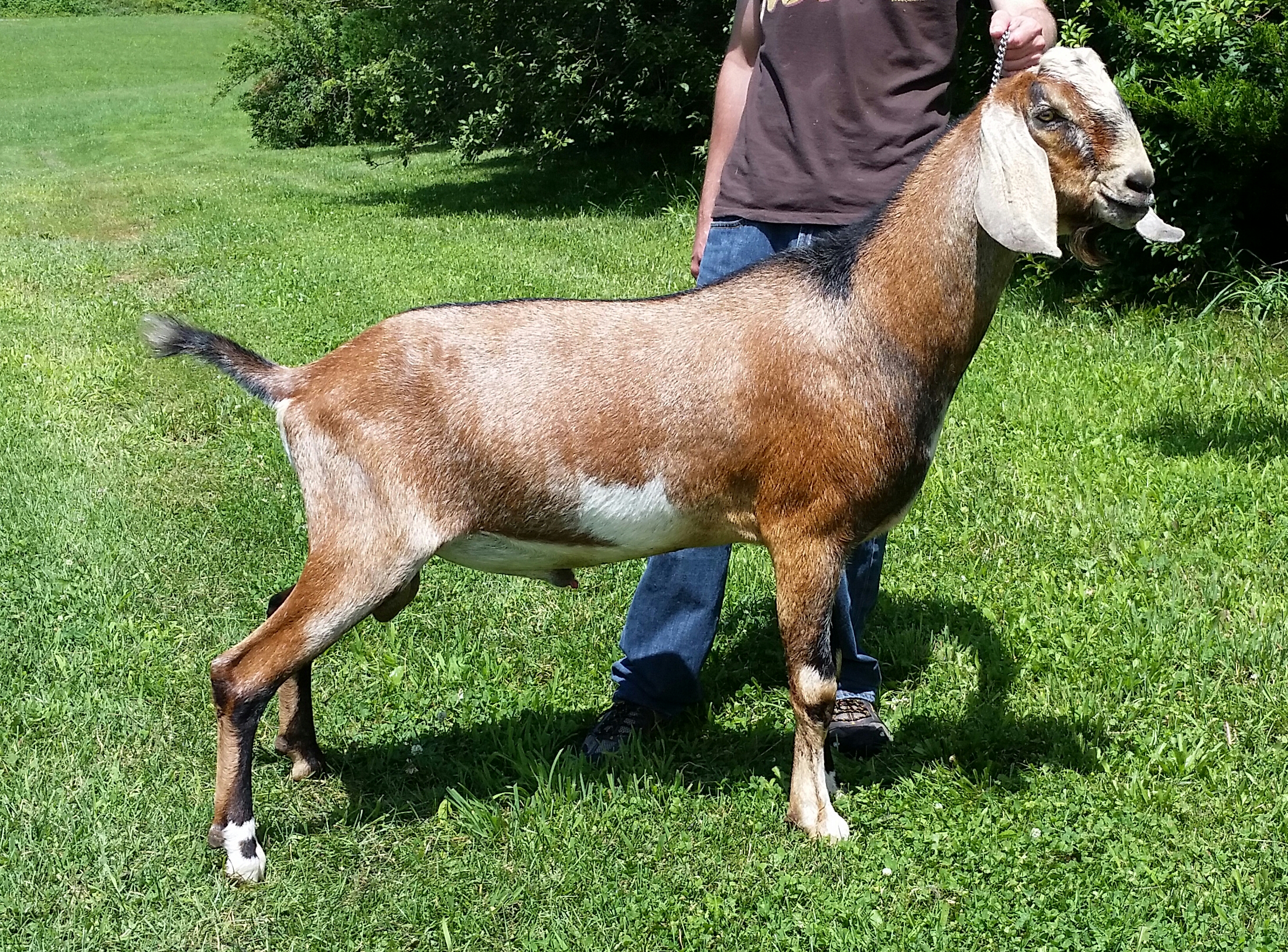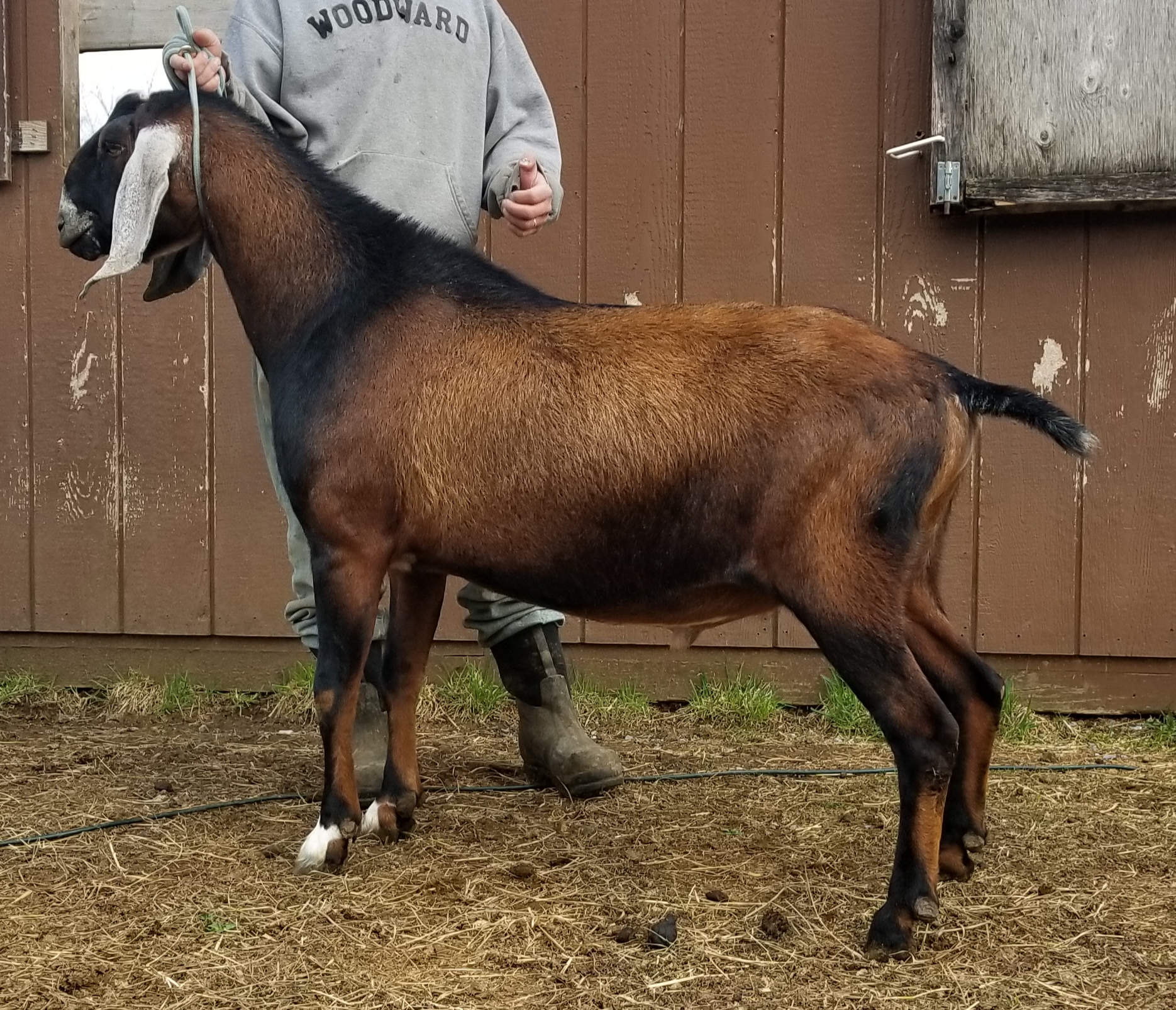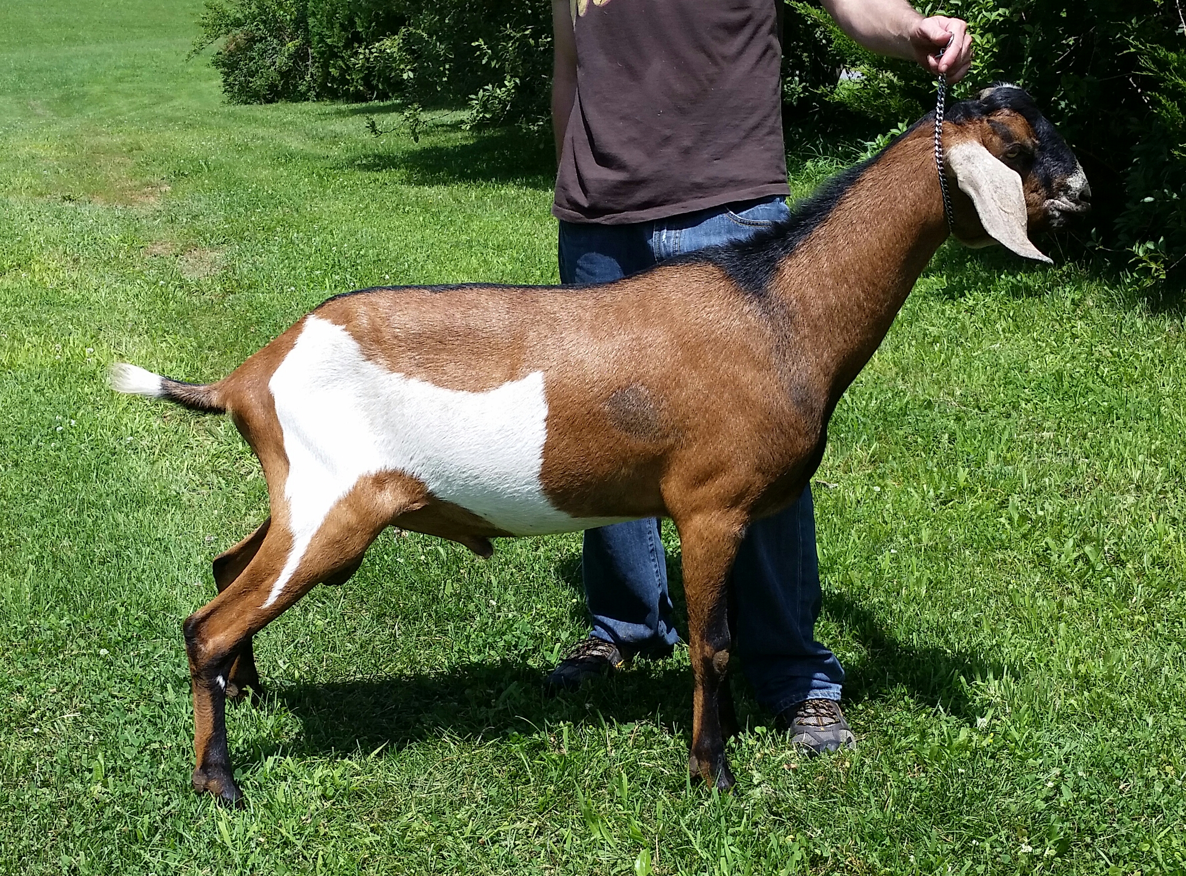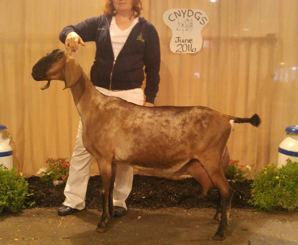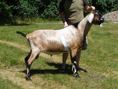 In 2012, I was taken by a beautiful blue roan doe kid on Facebook. She was from the famous Kastdemur herd, but had just moved to Minnesota. I obsessed over that doe for an entire year. The next summer I saw updated yearling pictures of the doe and decided that I wanted a buck kid from that doe. I rarely gamble on first fresheners for new herdsires as I prefer to have a doe prove herself in the show ring and the milk bucket before using her sons as herdsires. At the 2016 ADGA National Show, Viva placed 6th in a large 4yr old class. Gambler did not do well in our multi-buck housing situation. He was the lowest buck in the hierarchy and was abused by the older boys. In his best interest, Gambler was sold to a 4H family where he would have a better life. We hope to bring him back in a few years or to at least use him via AI. |