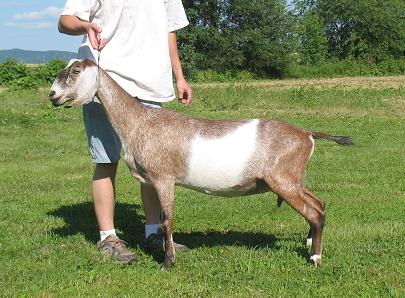 Isaac is a giant of a goat who passes that height, length, and dairyness onto his offspring. His daughter, Jolie, was the 2006 Reserve Junior National Champion. We hated to see Isaac leave the herd, but we have several daughters and also semen in the tank. So Isaac was sold in the fall of 2008.